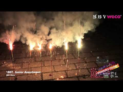 Klein assortiment met diverse types junior vuurwerk. Bijvoorbeeld Sterretjes met een lengte van 30 centimeter, Sterretjes met een lengte van 16 centimeter, spectaculaire Morning Glory sterren met een lengte van 40 centimeter, Party Poppers, Bottle Poppers, Knalerwten en trektouwtjes.