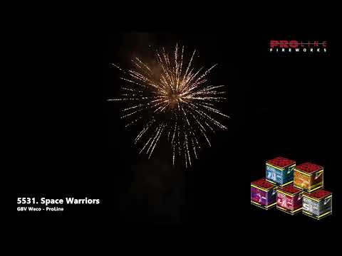 Pro-line Fireworks, Spacewarriorz, vuurwerkpakket. Dit pakket bestaat uit 5 stuks siercakes met ieder 20 schoten en een mooi uniek siereffect. In de selectie zit een schitterende blinker-cake, een sierlijke goud-cake, een knetterende crackling-cake, een kopergoud-cake en een mixed-blinker-cake. Een setje echte strijders om in 5 keer weg te stoken.