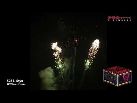 Pro-line Fireworks Styx, 41 shots, 25mm cake. Styx is de rivier welke de aarde van de onderwereld scheidt. Onze Pro-line Styx laat de grens duidelijk zijn met zijn 41 schoten gewaagd siervuurwerk. Met gouden palmen met gekleurde briljanten, en V-shape stijl glitterpalmen welke opstijgen met een befaamde draaiende staart en een spider-stijl finale zeer indrukwekkend.